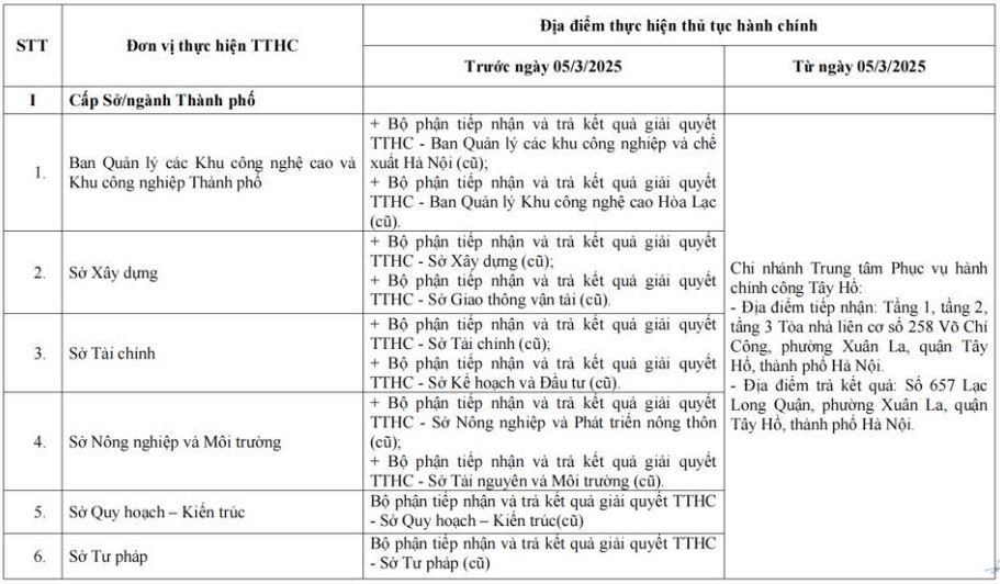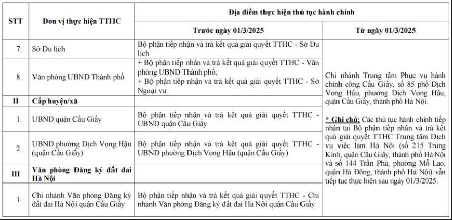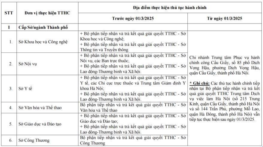 Theo Quyết định số 151/QĐ-TTPVHCC ngày 26/2/2025, các thủ tục hành chính tại Hà Nội sẽ được thực hiện tại các địa điểm sau: